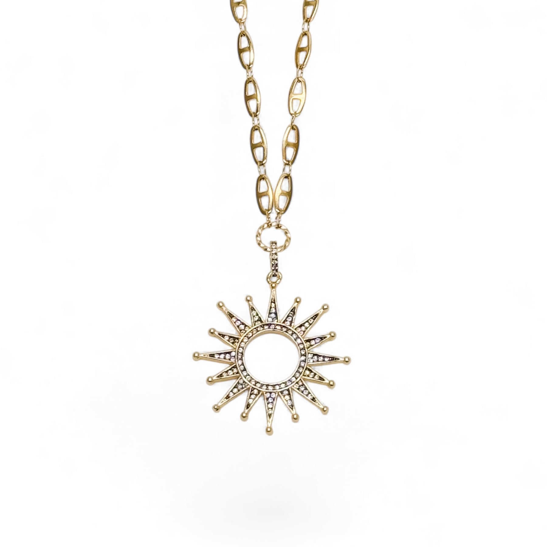 Radiant and refined, this Winter Sun Necklace captures light with its striking sun ray design adorned with pavé-set cubic zirconia stones. The mixed metal pendant blends warm and cool tones for an effortlessly elegant aesthetic that transitions seamlessly from day to evening wear. A sophisticated statement piece that adds luminous dimension to any ensemble.