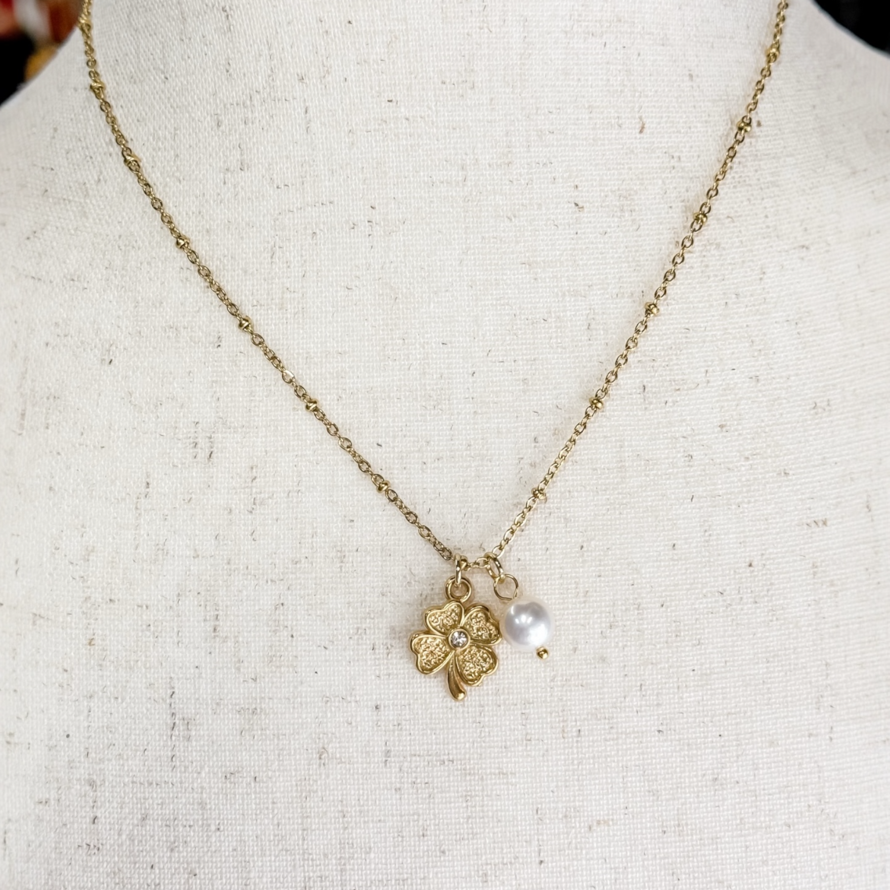 Suspended from a delicate gold satellite chain, this piece feels light and effortlessly elegant. The subtle texture of the clover catches the light, while the pearl adds a soft, romantic finish that makes this necklace perfect for everyday wear or meaningful gifting.