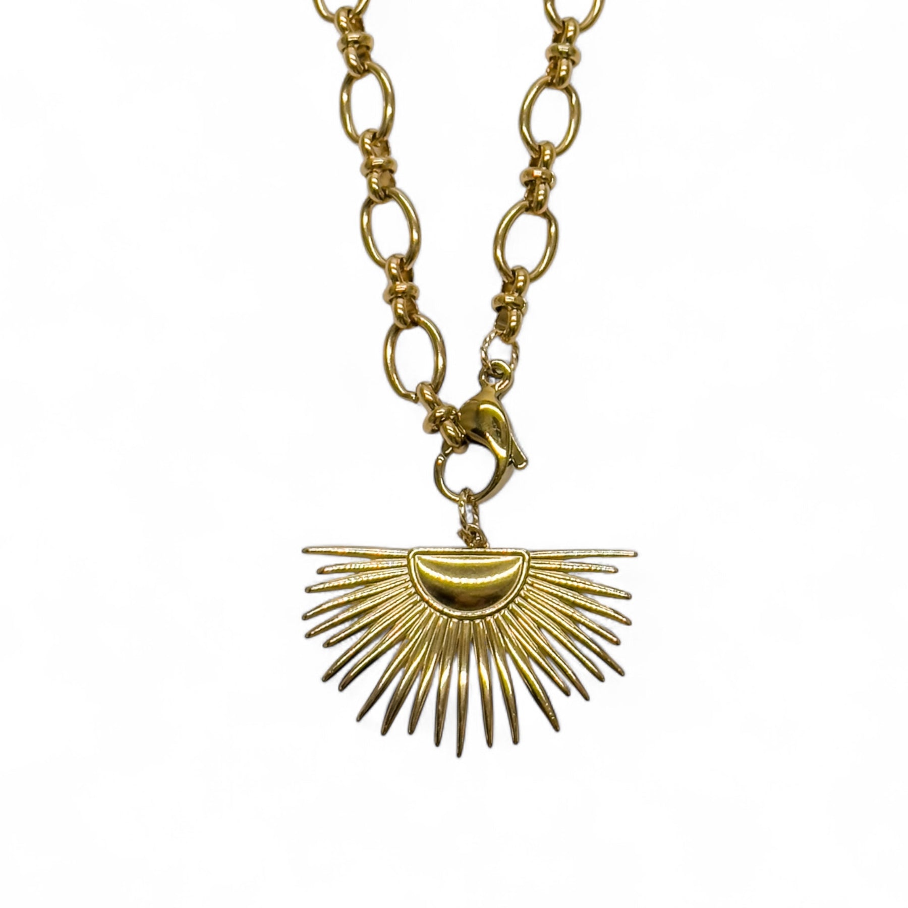 The Ellis Sunray Necklace is a bold statement piece that refuses to play by the rules. Wear the striking pendant front and center on the lobster clasp for maximum impact, or detach it and rock the chunky chain solo for an edgier, more understated look. This convertible design means one necklace, endless possibilities—perfect for anyone who demands versatility without sacrificing style. Whether you're going daring or classic, this piece adapts to your mood and your wardrobe.
