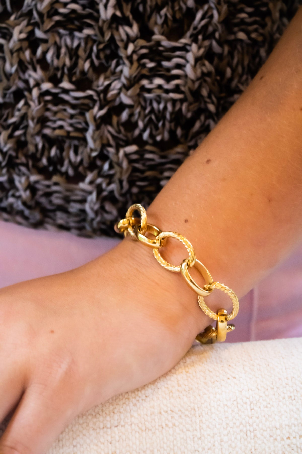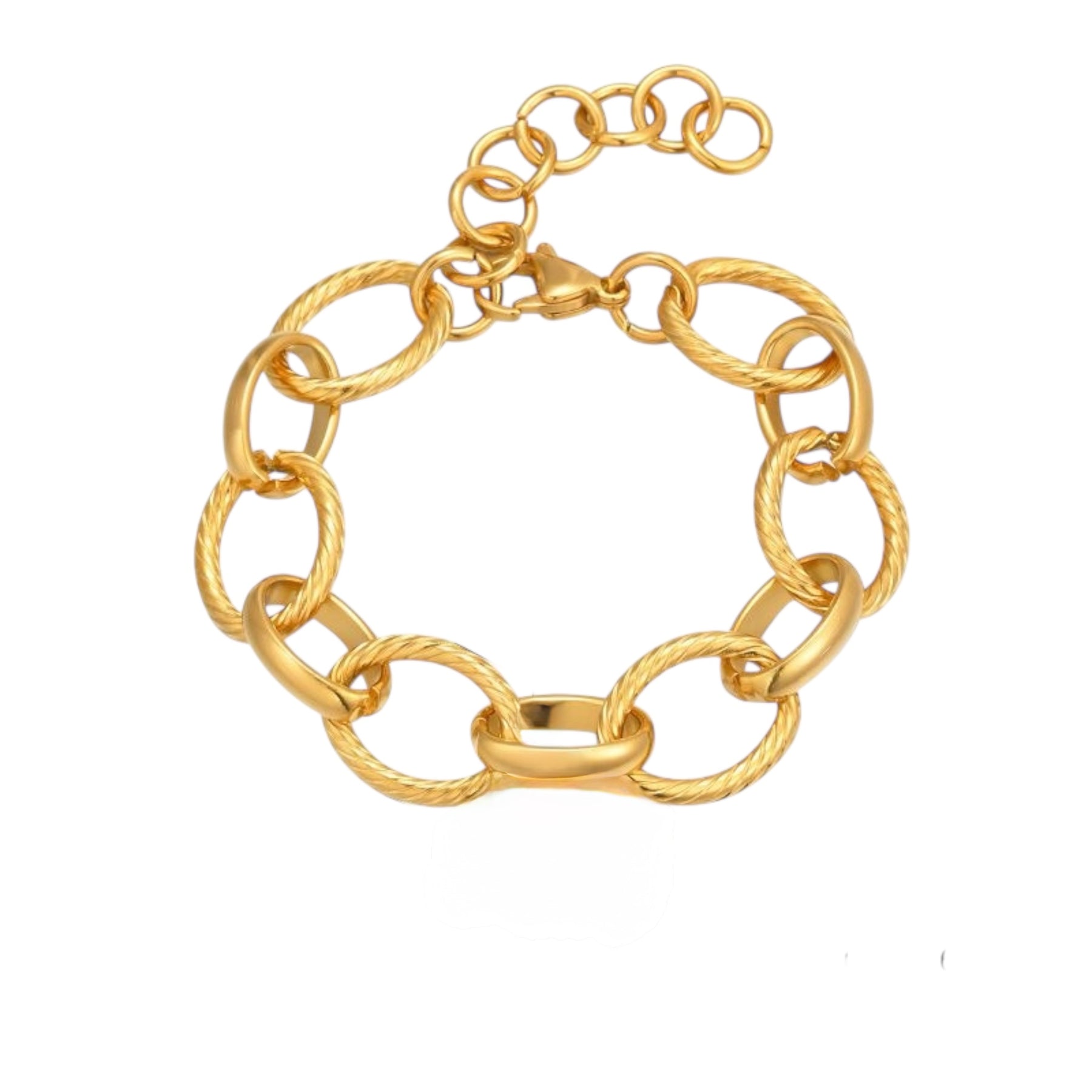 Elevate your everyday style with the Rowan Chunky Link Bracelet, a sophisticated piece that seamlessly transitions from day to night. Crafted from 18k gold-plated steel, this bracelet features a striking interplay of textured and smooth links that create visual depth and dimension. The substantial chunky design makes a refined statement while remaining light and comfortable for all-day wear. A timeless addition to any jewelry collection that pairs effortlessly with both casual and polished looks.