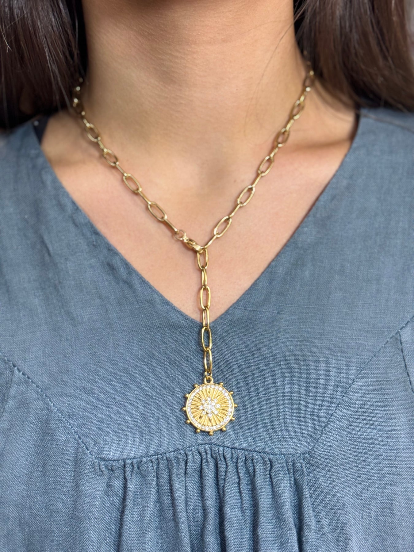 Shake up your everyday style with this refined necklace, designed to catch the light at every turn. Featuring a delicate paperclip chain and an exquisitely textured pendant adorned with a sparkling cubic zirconia north star and beaded detailing, this piece brings understated glamour to any look. The front lobster clasp allows for effortless length adjustment, ensuring a perfect fit for any occasion. A sophisticated touch of sparkle that transforms the ordinary into something extraordinary.