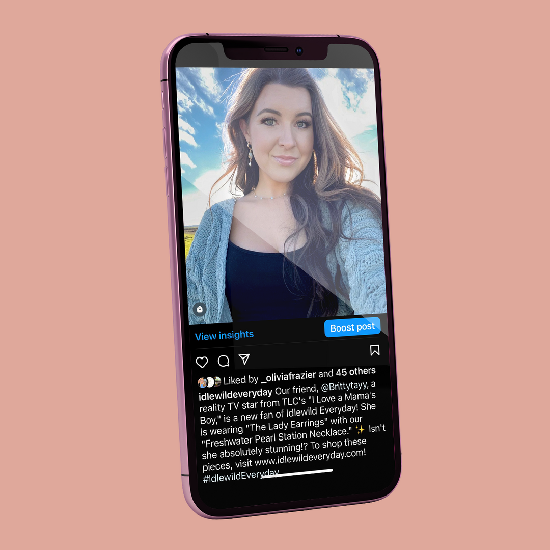 Brittany Taylor from TLC's I Love a Mama's Boy gave a heartfelt shoutout to Idlewild on Instagram, wearing our "The Lady Earrings" and a "Freshwater Pearl Station Necklace," perfectly highlighting our pieces' timeless elegance.